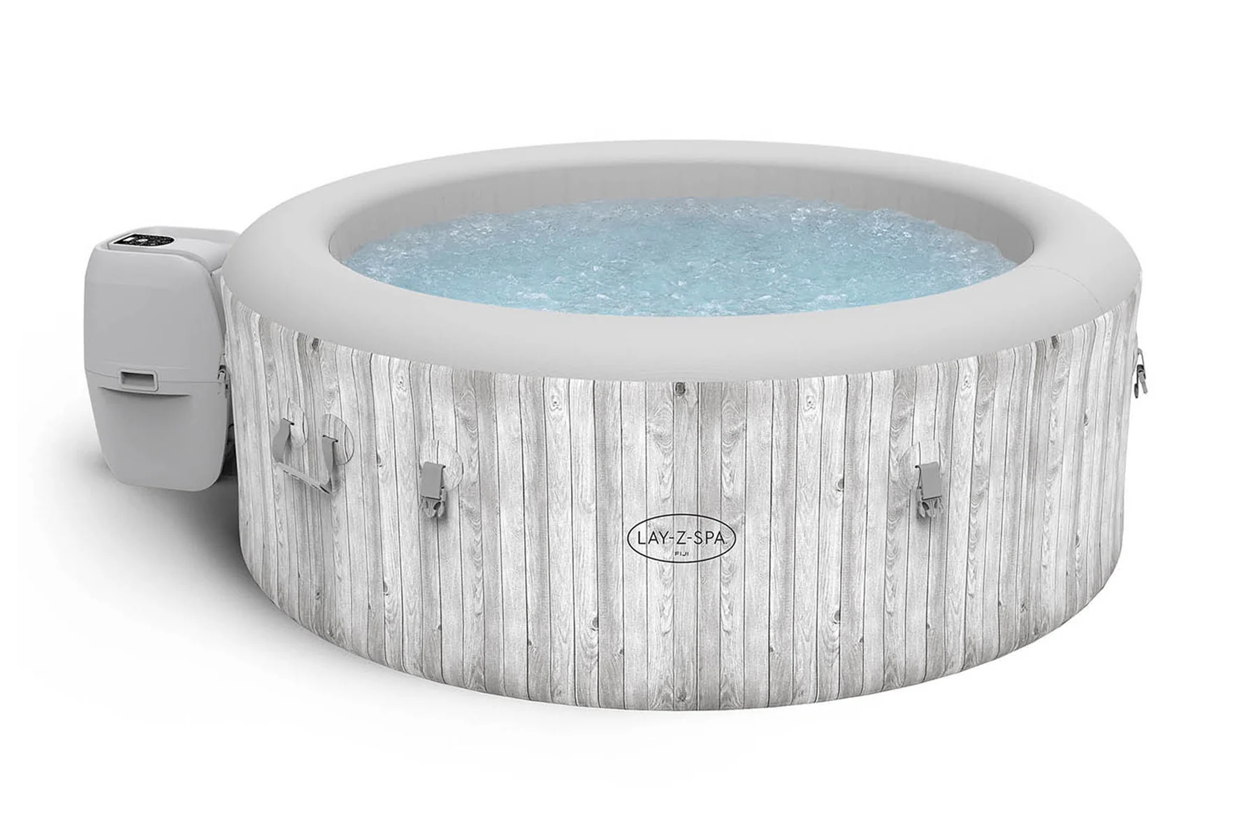 Experience relaxing and unwinding at home and positive benefits to health and well being with the Lay-Z-Spa Fiji AirJet™, a 6 person inflatable hot tub in a light wood finish. ///